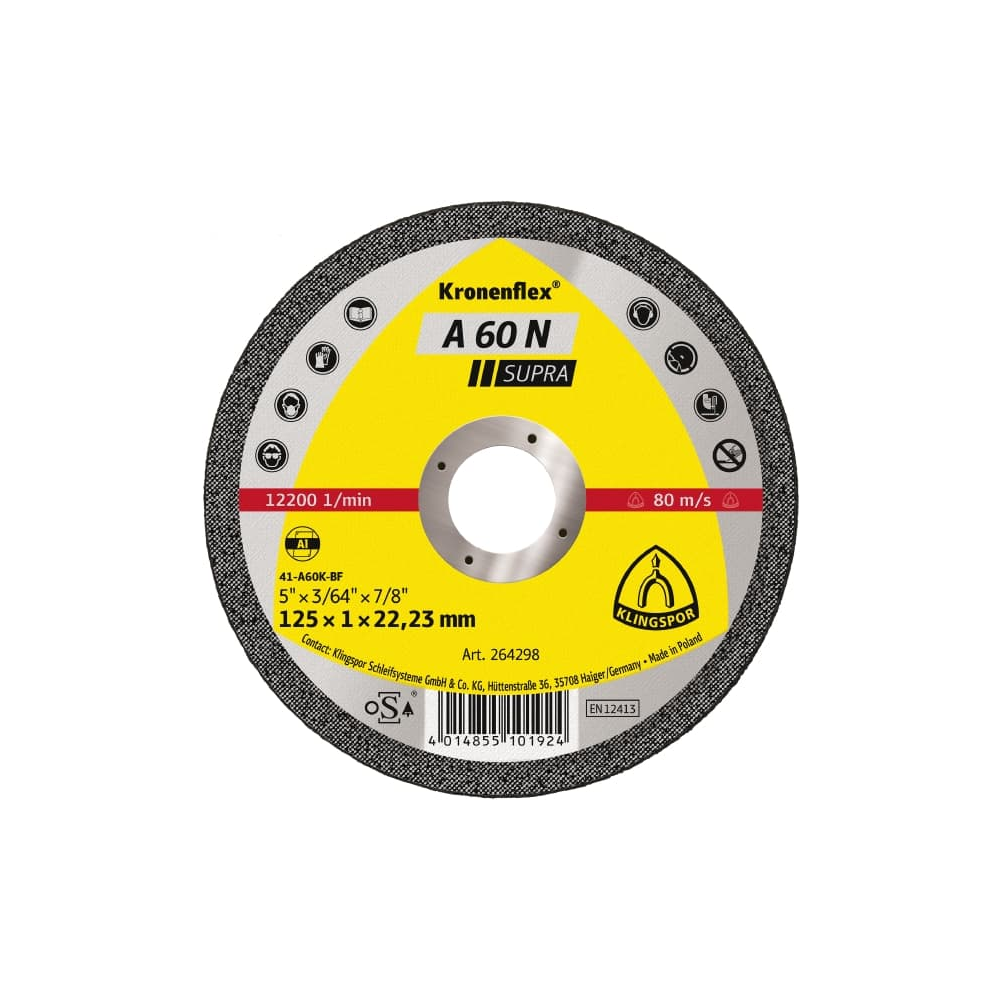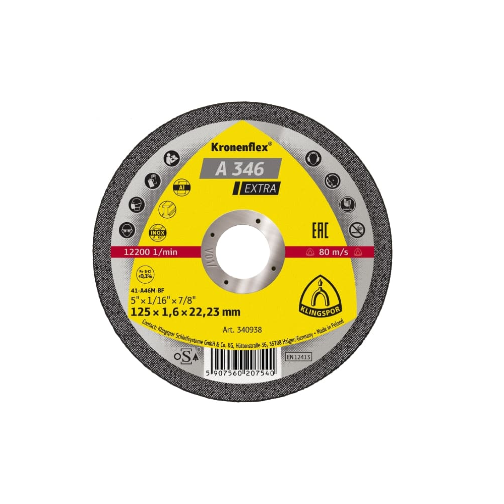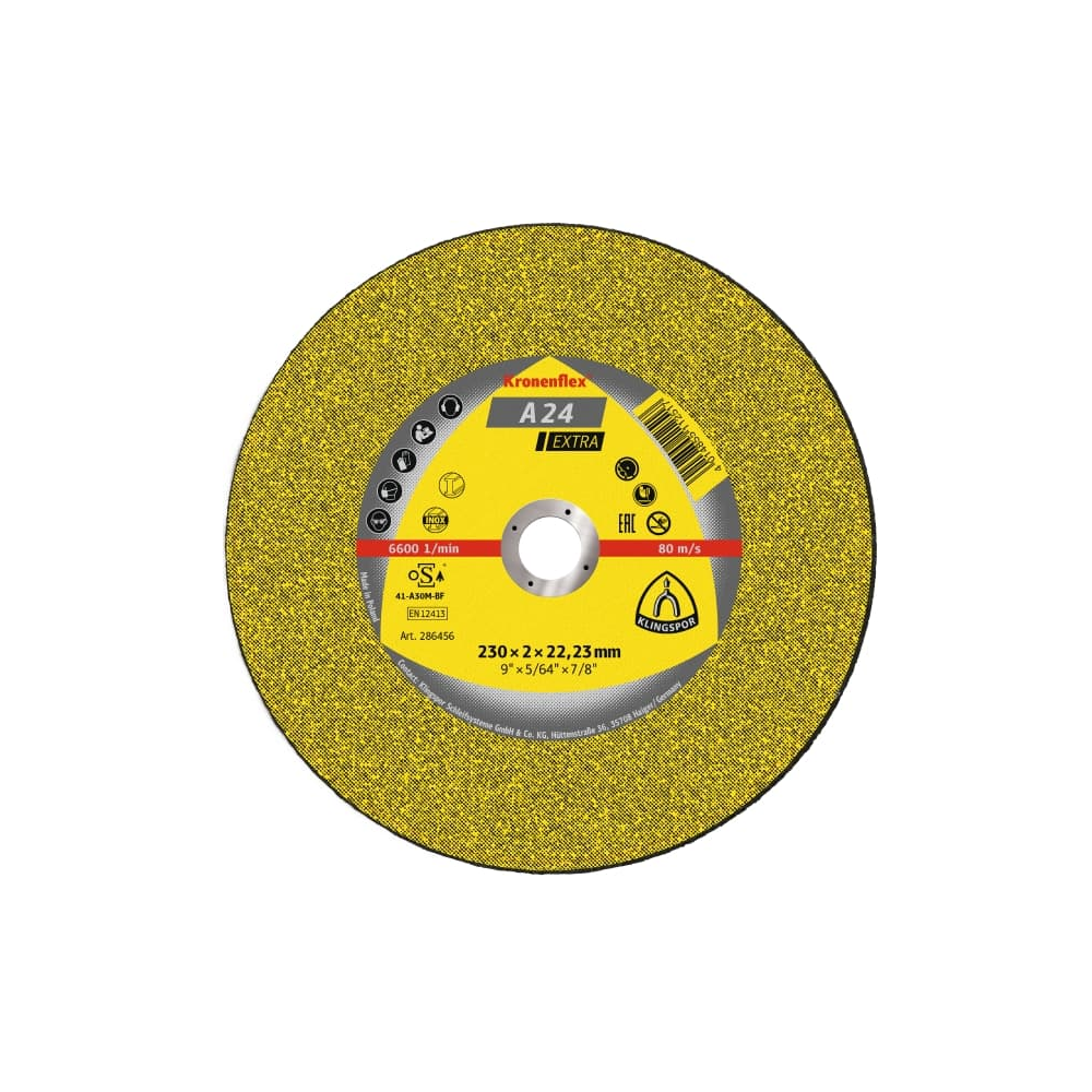 Klingspor bietet die hochwertigen Kronenflex Trennscheiben in verschiedenen Qualitätsstufen an. Trennscheiben der Qualität Extra sind das Universalprodukt für den vielseitigen Einsatz auf handgeführten Trennmaschinen. Wie alle Schleifmaterialien von Klingspor sind die Trennscheiben mit einem synthetisch hergestellten Schleifkorn ausgestattet. Das bietet den Vorteil einer hohen Verschleißfestigkeit und gleichbleibenden Qualität über die gesamte Einsatzzeit. Zur Befestigung des Korns dienen Harze und weitere Füllstoffe, die optimal auf den jeweiligen Einsatzzweck abgestimmt sind. Im Fall der Trennscheibe A 24 Extra sind die Materialien ideal für die Bearbeitung von Metall zusammengestellt.